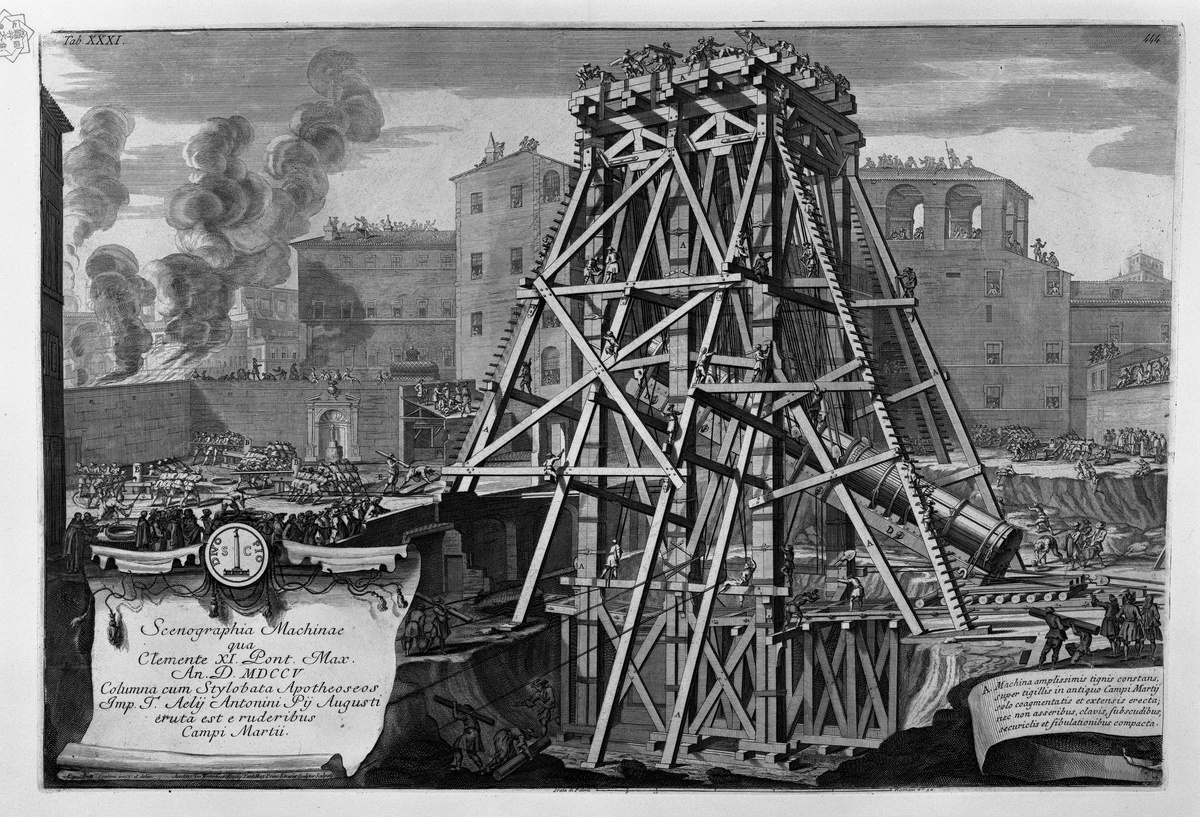 и вы увидите преемственность опыта поколений созидателей. Как только эти крановые сооружения не называли: машиной, лесами, каркасом и, даже, echafaudage (у Монферрана). Однако, предназначение их одно (подъём и установка длинномерных тяжёлых предметов), и средства одни и те же: каркасная конструкция, кабестаны, полиспасты и мускульный труд многих людей. Материалы вполне доступные - дерево, железо, пеньковые канаты.