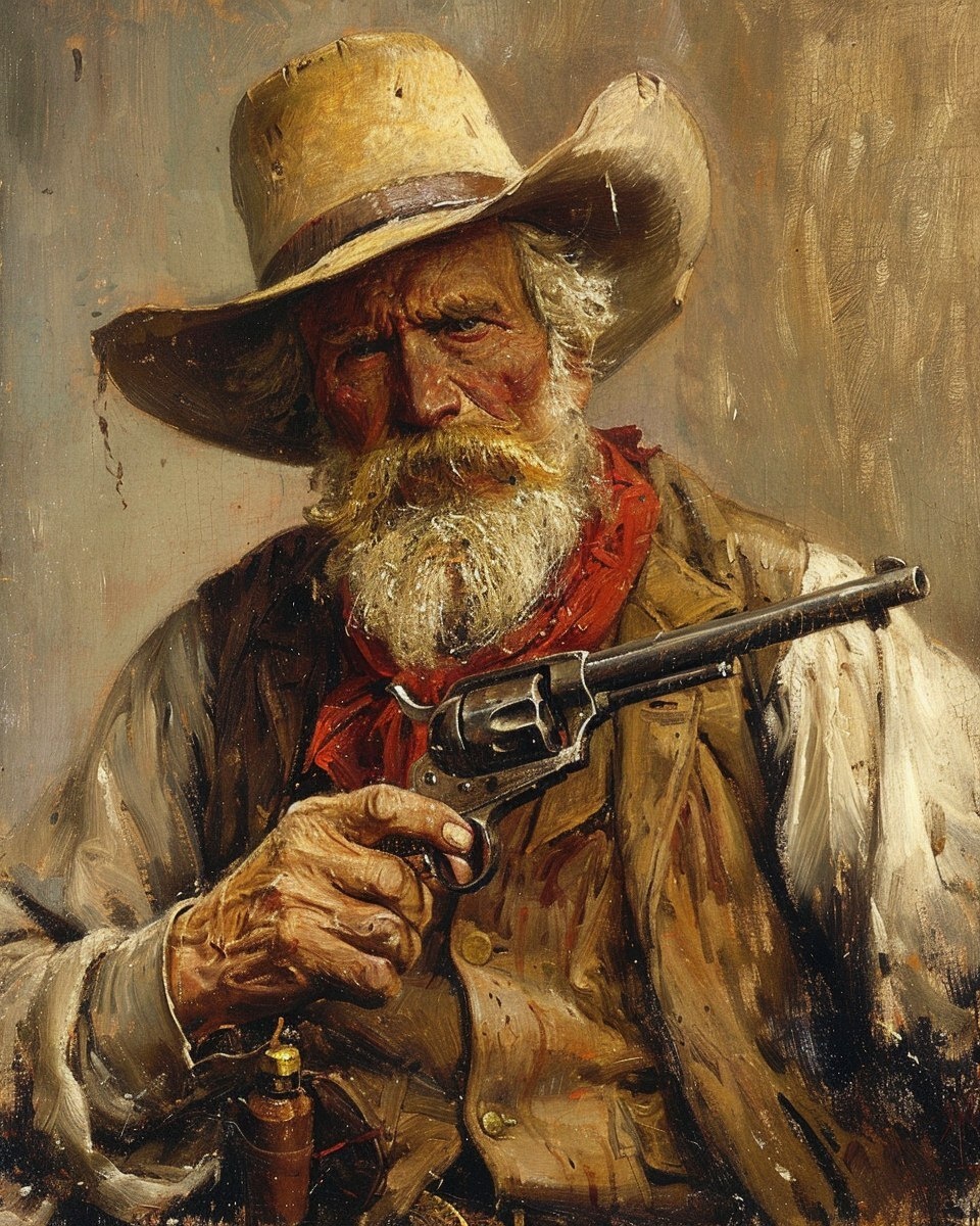 Создано на основе запроса: Old man year 1885, an old cowboy with a smoking pipe in the corner of his mouth and holding a colt pistol --- Автоперевод: Старик, 1885 год, старый ковбой с курительной трубкой в углу его рта и держит пистолет жеребенка Неплохо выглядит? 🤔 https://dzen.ru/id/65c0c65c86e4f837c27b24d7 #ИИ #AI #нейросеть #midjourney #art