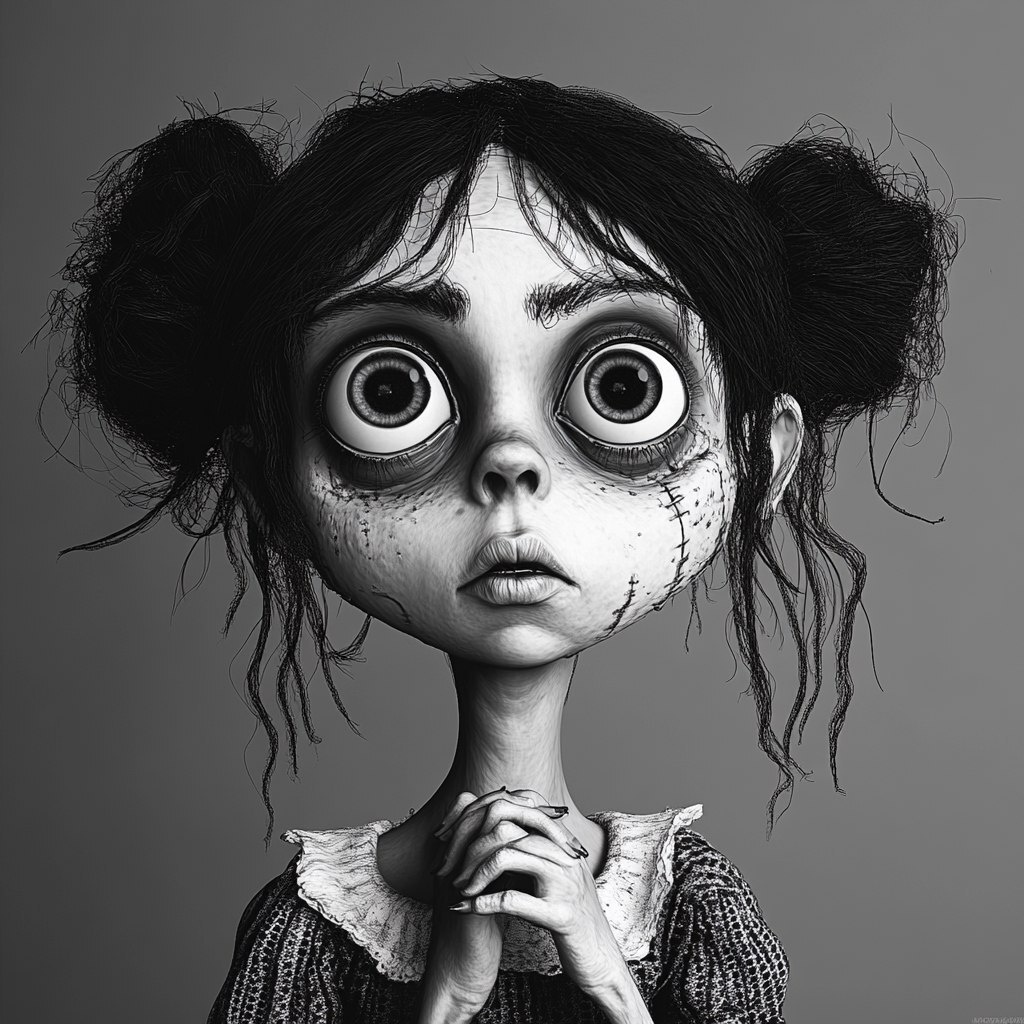 Создано на основе запроса: Photo of realistic girl character in the style of Tim Burton and David for representing OCD and various