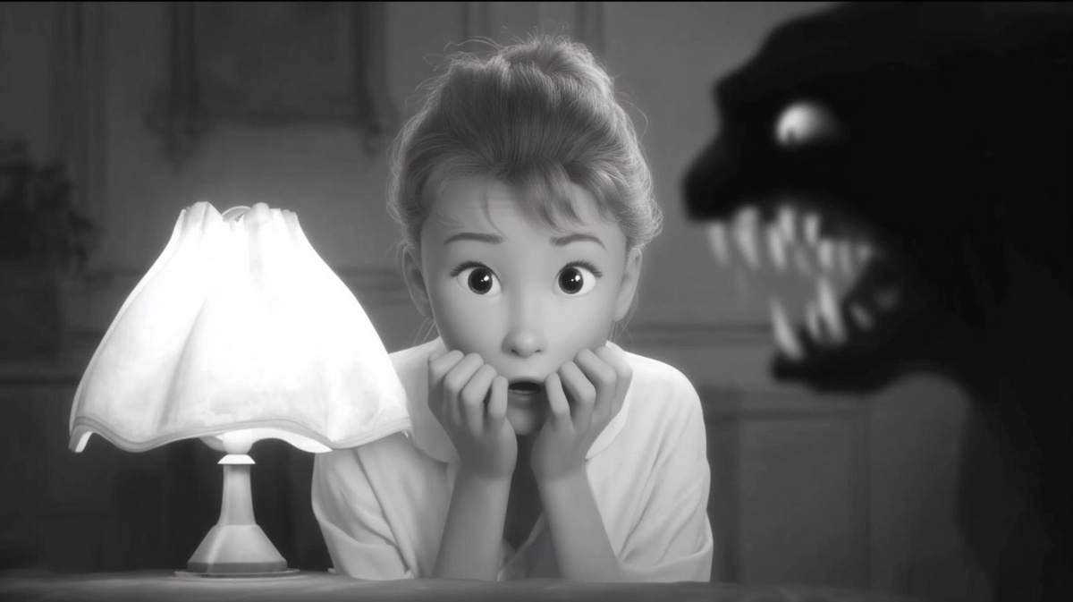 Создано на основе запроса: lone, gamine lady, afraid, single light source, kitschy lamp, sparse, monster lurking, uneasy tension, light
