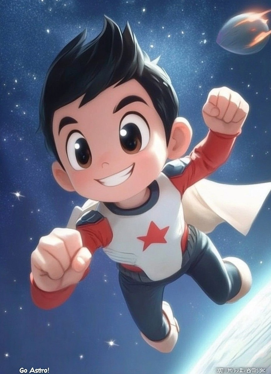 Создано на основе запроса: "Go Astro!" bold title, super famicom poster, Astroboy, dynamic pose