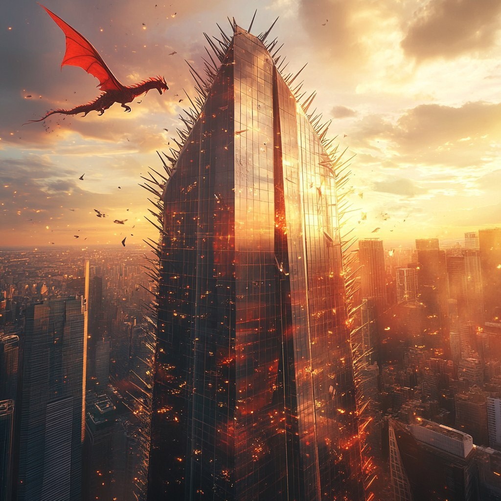 Создано на основе запроса: glass dramatic, skyscraper spiked with long dangerous metal elements, with shattered glass around, during golden hour, realistc, with a red dragon flying over the building --- Автоперевод: Стеклянный драматический, небоскреб с длинными опасными металлическими элементами, с разбитым стеклом вокруг, в золотой час, реалистичный, с красным драконом, пролетающим над зданием Что скажешь? 🤔 https://dzen.ru/id/65c0c65c86e4f837c27b24d7 #ИИ #AI #нейросеть #midjourney #art