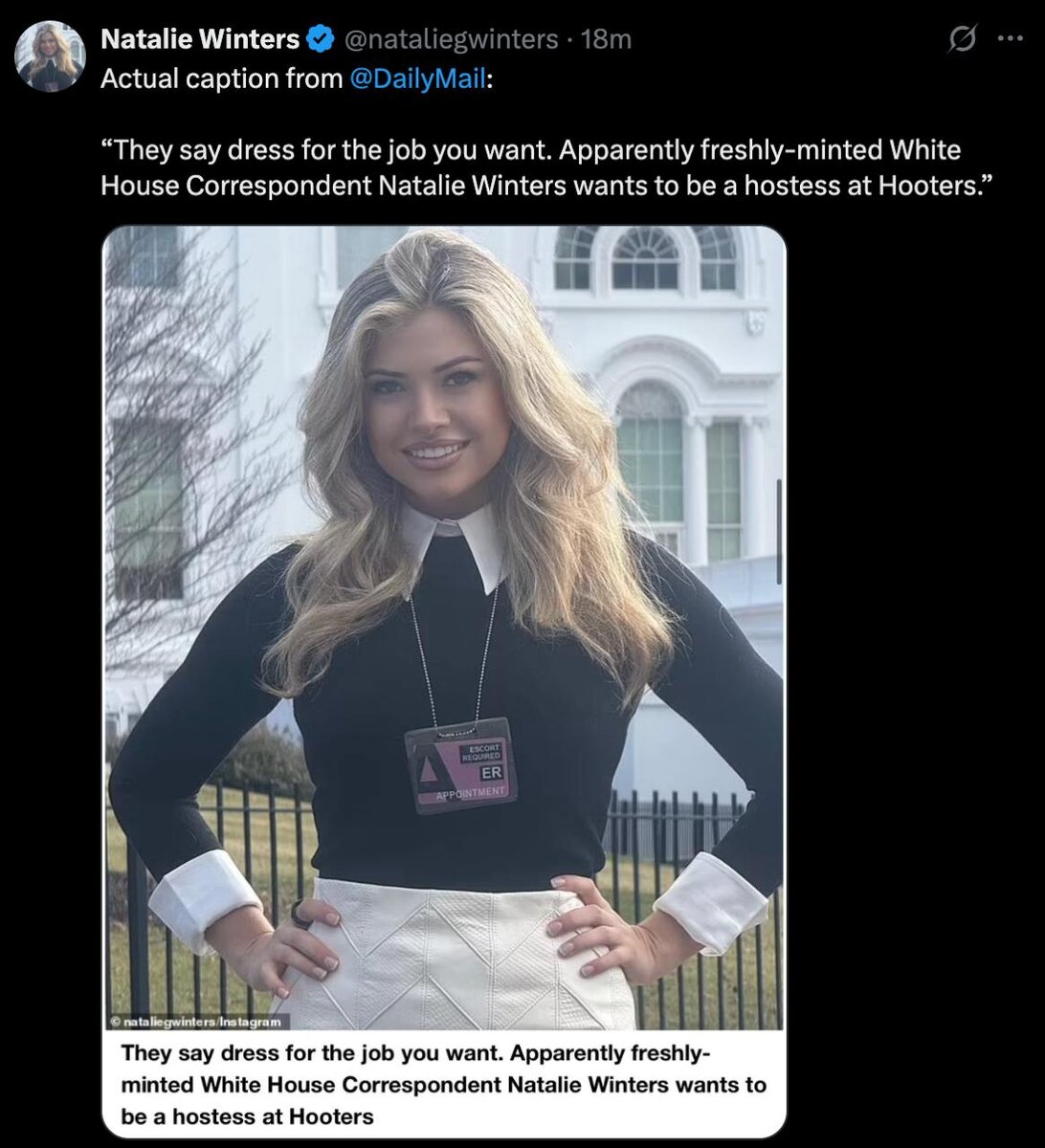 WH correspondent Natalie Winters calls out the Daily Mail’s gutter-trash Hooters jab at her wardrobe — did somebody order sour grapes? #WH