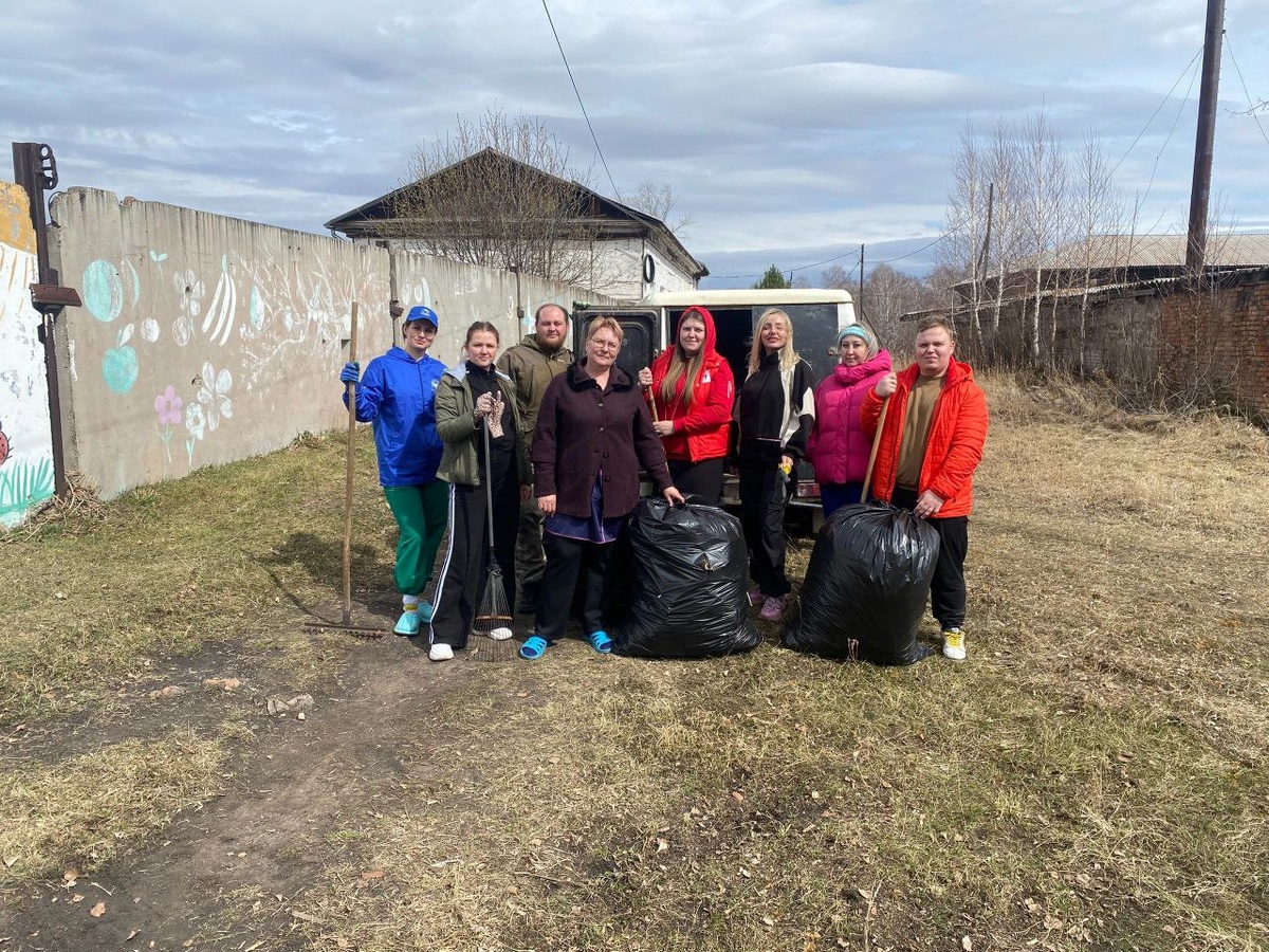 Дружный коллектив молодежного центра «Импульс», спортивной школы и Движения Первых провели масштабную уборку прилегающей территории