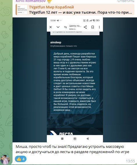 Привет, команда! Почитал ваши предложения под вчерашним постом — и скажу честно, вы тронули меня за самое сердечко. Спасибо за добрые слова, идеи и поддержку ❤️ Особенно зацепил повторяющийся запрос… на кепа канала. Серьёзно? Гетфан в игре? Это прям тёпло и по-домашнему звучит. Я бы в другой ситуации отмахнулся, но сейчас думаю — а вдруг?.. Если в танках уже есть командиры от блогеров, а в кораблях начали появляться виртуальные образы для розыгрышей — может, и у нас есть шанс? Как считаете, есть ли в этом потенциал? Вы бы хотели такого кепа у себя в порту? Пишите честно 👇 Это пока просто идея, но если вас будет много — возможно, её услышат.