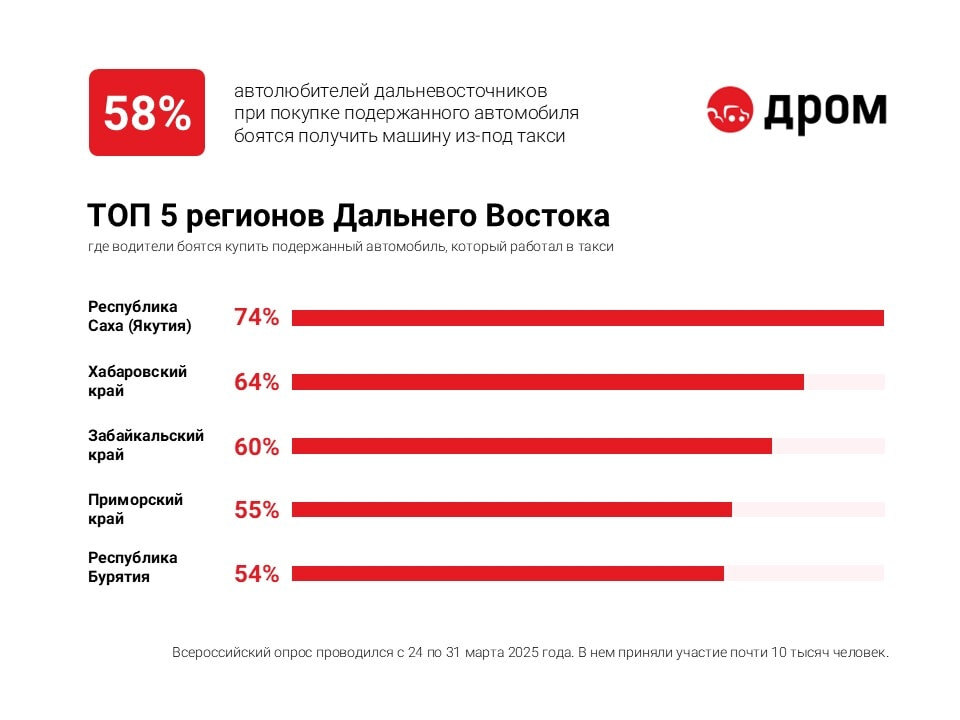 Автомобильный сайт «Дром» провел опрос, в результате которого выяснилось, что 64% жителей Хабаровского края при покупке машины боятся получить автомобиль после такси. Нет такого опасения у 32% респондентов, и только 4% опрошенных сказали, что покупают новое авто. В России 62% автомобилистов боятся купить подержанный автомобиль, который работал в такси. Не испытывают такого страха 30% опрошенных. 8% автолюбителей сказали, что покупают только новое авто. Среди регионов страны больше всего жители Крыма и Якутии боятся купить автомобиль, на котором раньше таксовали, — по 74% опрошенных дали такой ответ. Страх получить машину после такси есть у 72% автолюбителей из Омской области и из Татарстана, а также у 71% жителей Челябинской области. Меньше опасения при выборе автомобиля с пробегом у дальневосточников и сибиряков. Не боятся купить машину после такси 44% жителей Амурской области, 40% — из Бурятии, 38% — из Приморья и по 37% — из Иркутской области и из Красноярского края. Альтернативный