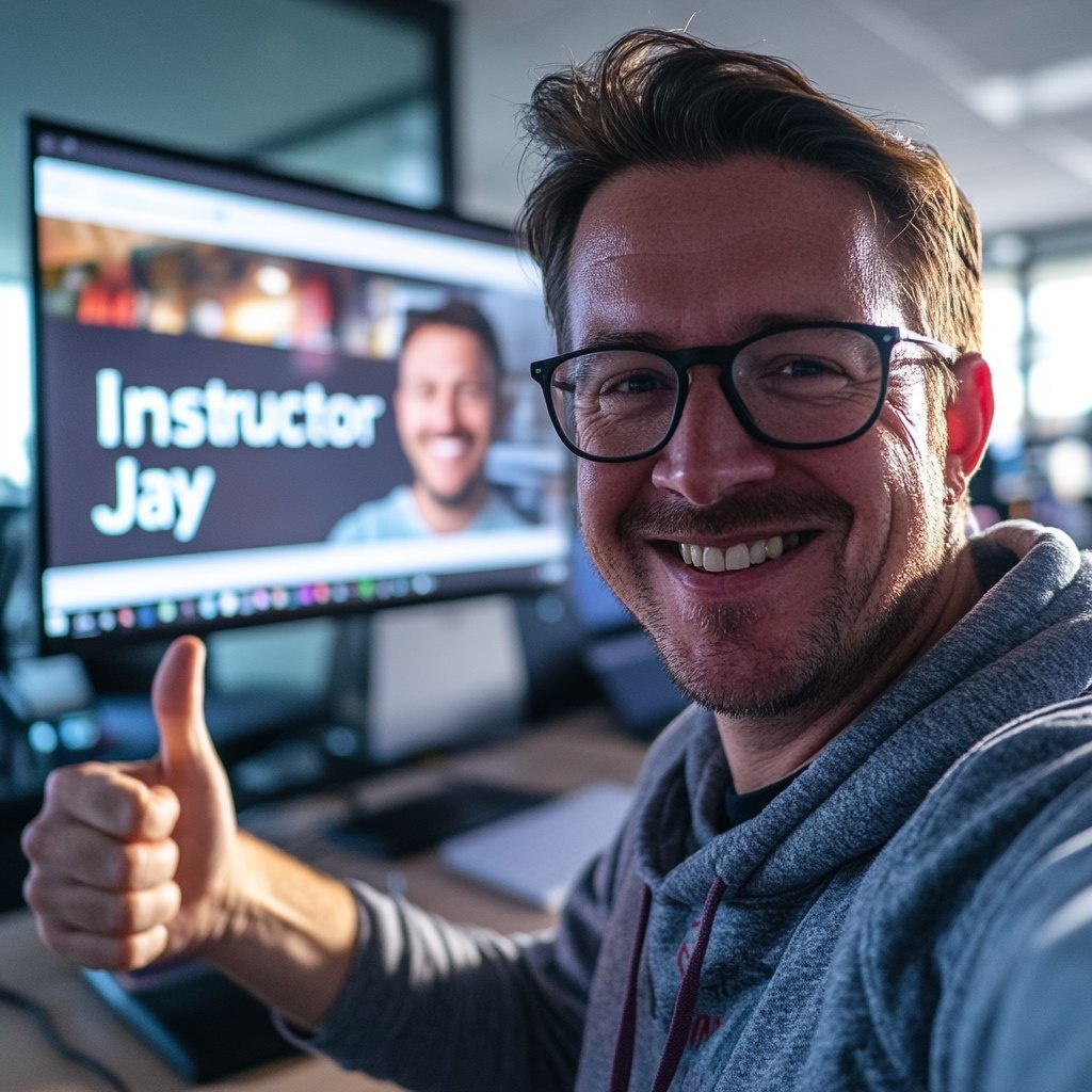 Создано на основе запроса: man taking a selfie giving a thumbs up, computer screen in background with "Instructor Jay" on the screen