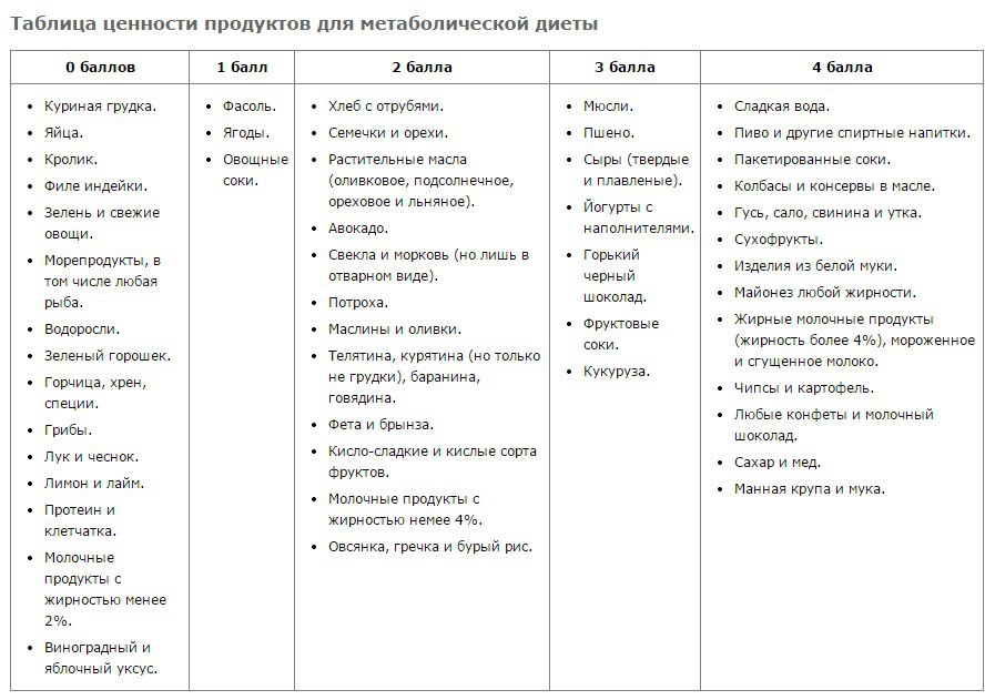 Один из методов метаболического похудения — метаболическая диета. В ней продукты условно разделены по баллам, которые имеют связь с калорийностью продукта. Конкретного меню нет, но устанавливается количество баллов на каждый приём пищи в разные этапы диеты.