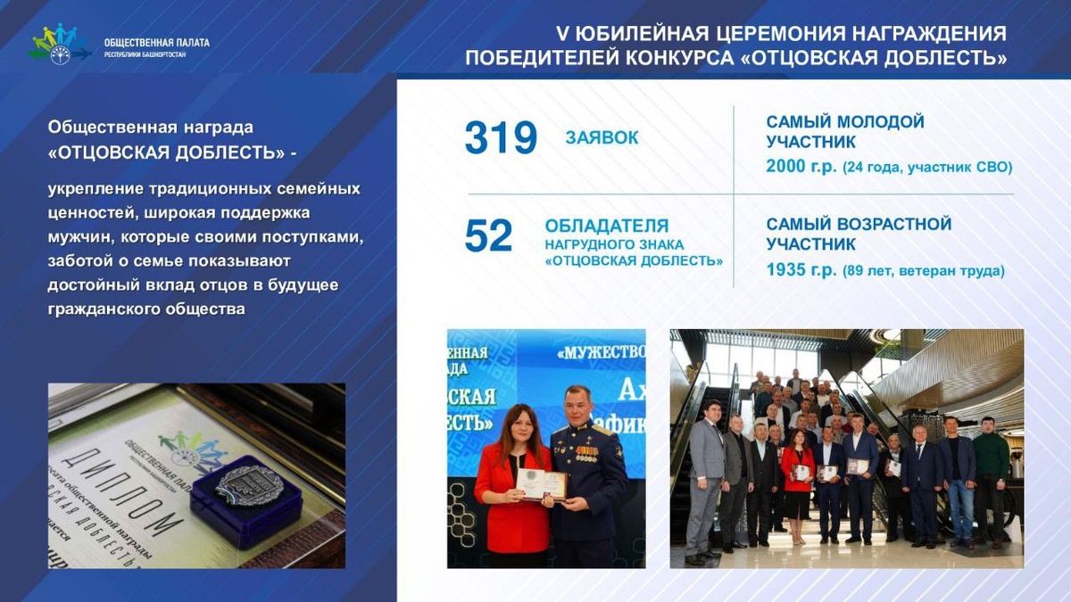 В 2024 году в Республиканском конкурсе на соискание общественной награды «Отцовская доблесть» приняли участие 319 мужчин со всей республики – это рекордное количество заявок за все годы проведения конкурса. По решению жюри обладателями нагрудного знака «Отцовская доблесть» стали 52 человека. Наибольшее количество заявок было подано из Уфы и Чишминского района. Самому молодому участнику было 24 года, а самому старшему - 89 лет. Такие данные опубликованы в ежегодном докладе о состоянии гражданского общества РБ за 2024 год. В нем отражены итоги работы палаты за прошлый год, а также ключевые тенденции развития гражданского общества в регионе. Между тем, в 2025 году прием заявок на Республиканский конкурс «Отцовская доблесть» стартовал и мы очень ждем ваши заявки. Участникам нужно заполнить форму Общественная награда «Отцовская доблесть» направлена на укрепление традиционных семейных ценностей, поддержку отцов.