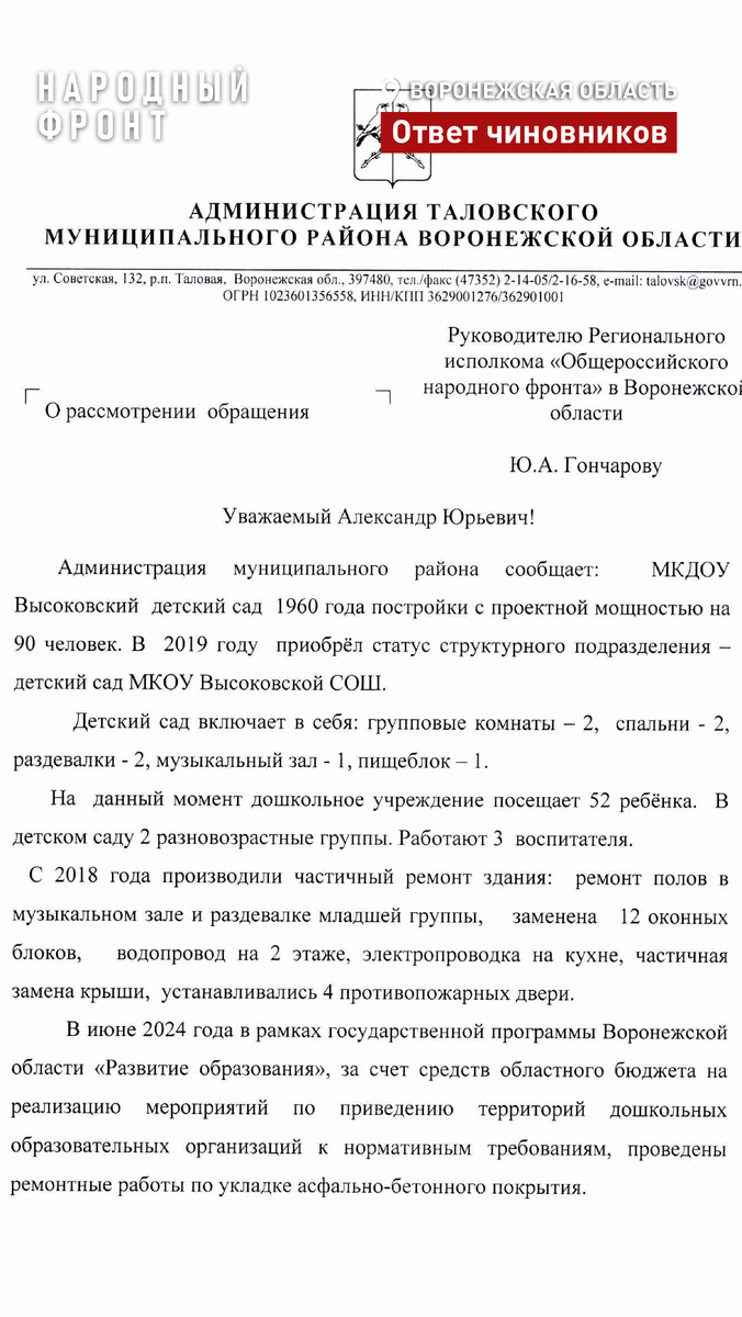 Ранее Народный фронт рассказал, что детский сад в поселке Высокий стал опасным для дошколят. И территория, и здание садика стремительно ветшают. Мы обратились в региональное министерство образования и в администрацию Таловского района.