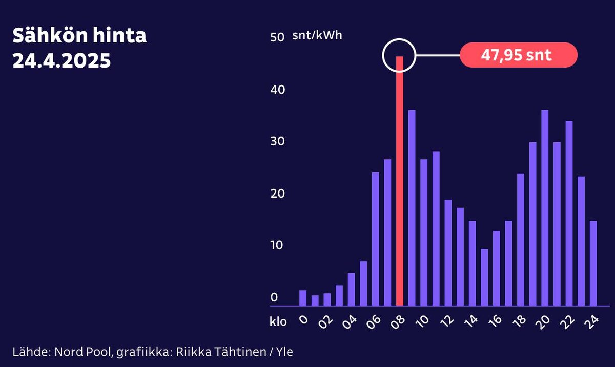 В Финляндии фиксируют ожидаемый рост цен на электроэнергию из-за очередных проблем с "Olkiluoto 2" и планового ТО на "Olkiluoto 3" Самая высокая оптовая цена приходится на 8 утра, когда она достигает 47,95 цента (₽44) за киловатт-час. В течение дня цена не опускается ниже 10 центов (₽9,45) за киловатт-час. Вечером с 19:00 до 22:00 цена превышает 30 центов (₽28,4) за киловатт-час.