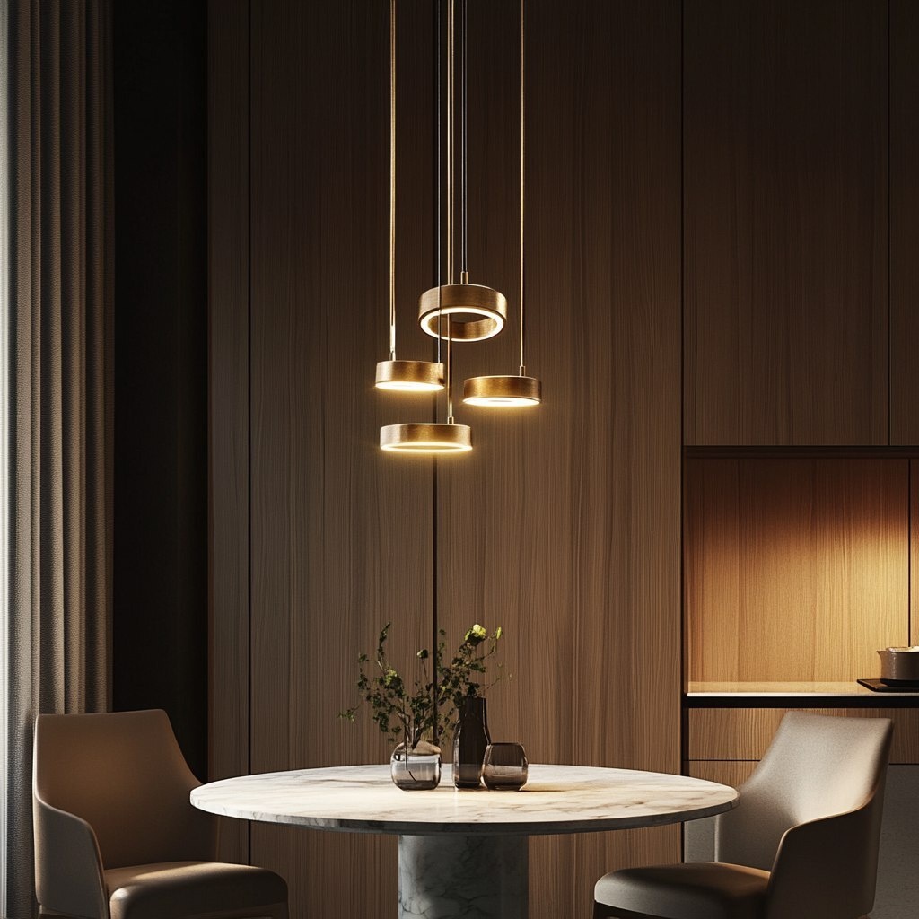 Создано на основе запроса: luxury modern dining room, sleek 3-chain pendant light hanging over a marble table, soft ambient lighting