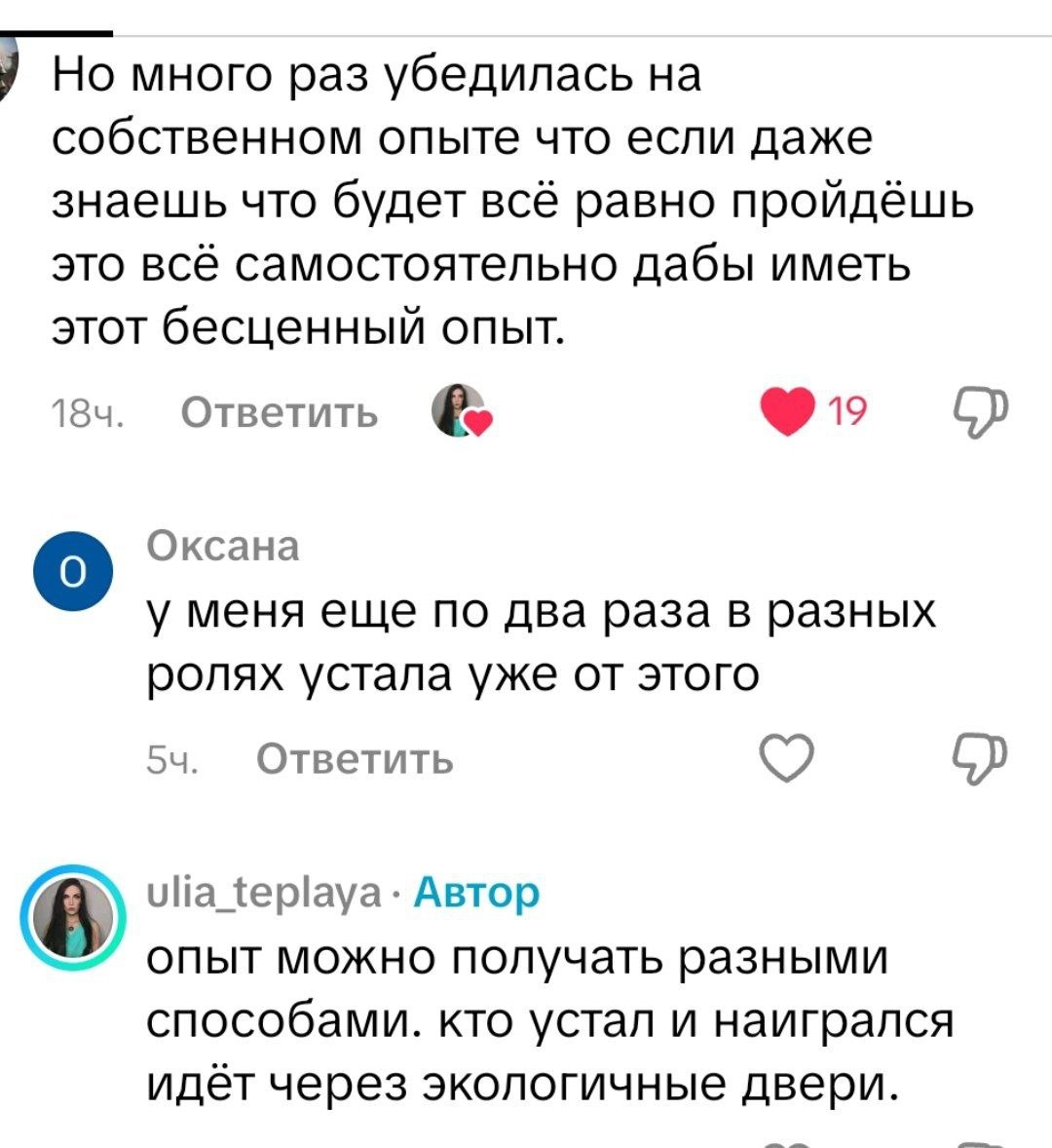 О том, как и через что проходят люди, получая опыт... могу написать одну или парочку книг. (Консультаций много, часов и историй хватит) Другой вопрос, вот в чем- задумайтесь, чем вы платите за опыт. Те кто понял и устал, и хотят получать это без проживания травмы, драмы и тд - идут осваивать инструменты для работы с собой и своими сценариями. А кто-то говорит: я очень устал, я еле выдержал, и меня снова шарахнуло. И я не знаю когда закончится. А оно не закончится... пока ты не поймёшь для чего оно все, и куда тебе и зачем. Именно поэтому я всегда говорю: бери инструкцию которую я даю и смотри что происходит в жизни. Для чего я веду эти курсы...