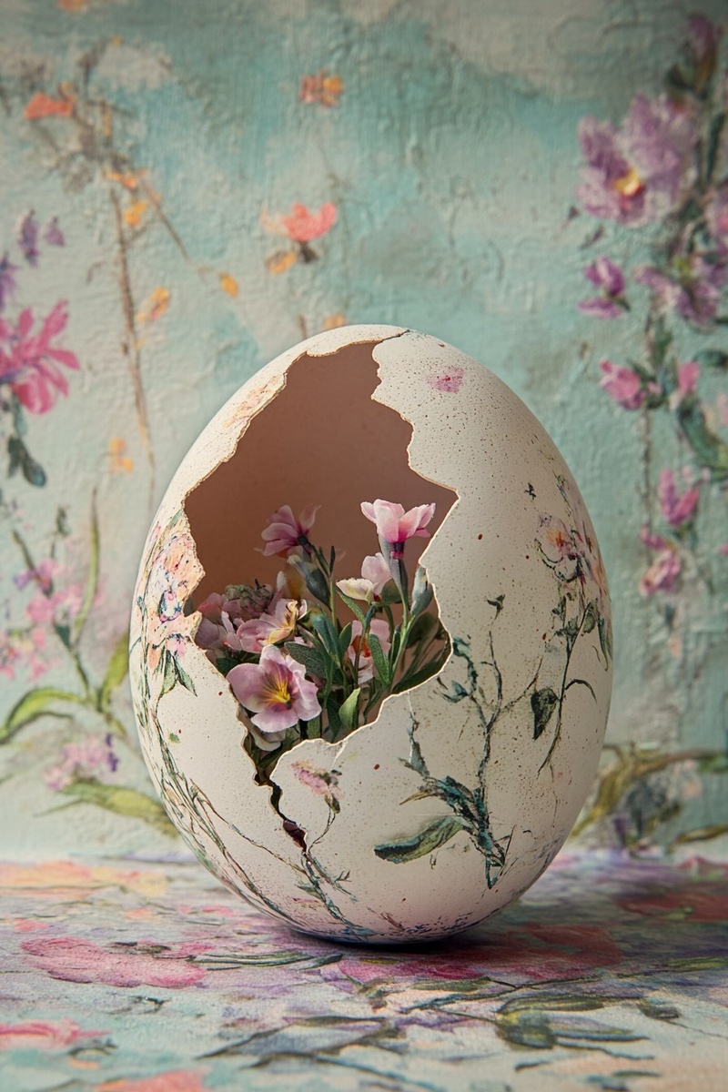 Создано на основе запроса: big egg cracked open to present something with flowers inside on a fine art flowery april background