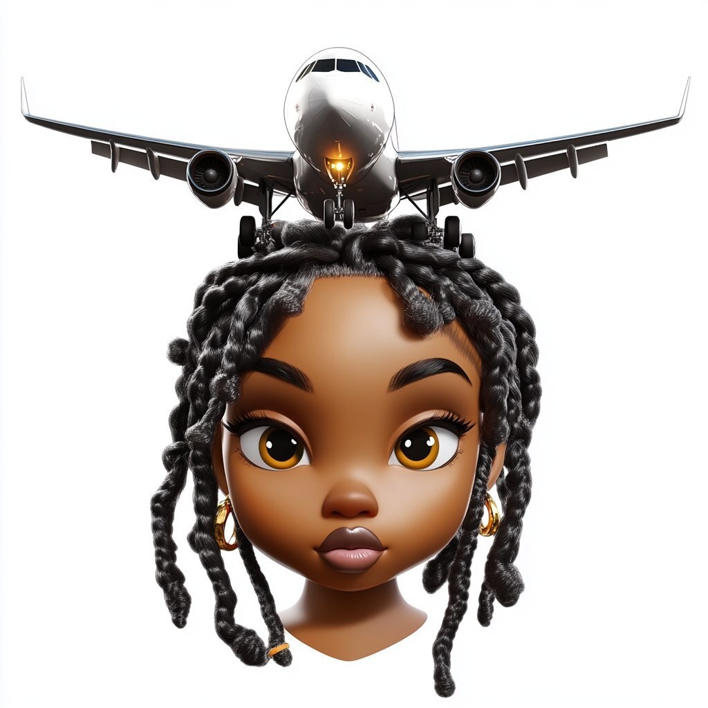 Создано на основе запроса: fun emoji of black girl with dreads who has an aeroplane landing on her head