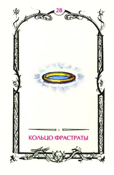 Кольцо Фрастраты это карта колоды, обозначает приворот, привязка, зависимость, слабость характера. Карта — это символ обмана в его традиционном смысле. Она похожа на камешек среди других камней. Если просто смотреть на неё, то ничего необычного не заметишь, но стоит присмотреться, и становится ясно, что с ней что-то не так. Есть какая-то деталь, которая нарушает общую картину. Этот маленький камешек может удерживать на себе огромное сооружение, сравнимое по размеру с Вавилонской башней. Если его убрать, то вся конструкция рухнет. Но самое страшное то, что обман скрыт настолько искусно, что сразу и не заметишь. На карте обозначен человек, который не обладает твёрдой уверенностью в себе и легко попадает под влияние более опытного и авторитетного человека. Зачастую такие отношения маскируются под дружеские, но на самом деле являются отношениями зависимости. Чрезвычайно тесная связь или обусловленность, зависимость от чего-либо или кого-либо.