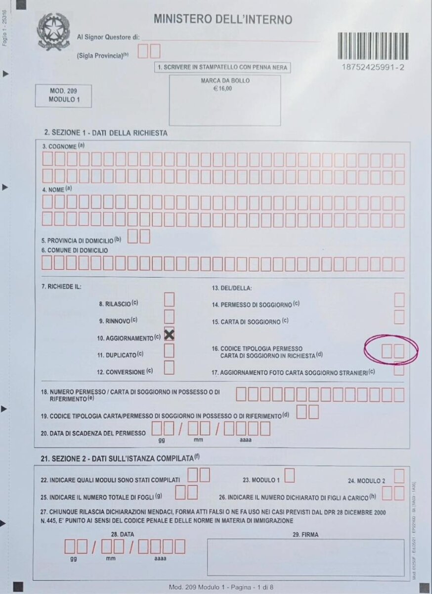 Если у вас новый загранпаспорт — вы обязаны обновить permesso di soggiorno! ⚠️ Для иностранцев в Италии обычно обязательны два документа: 1. Паспорт страны гражданства 2. Разрешение на проживание — permesso di soggiorno (или документ, его заменяющий) В permesso «зашиты» данные паспорта. Если паспорт обновился — данные нужно обновить. Как это сделать: - Берёте kit на почте - Заполняете модуль, в секторе 10 ставите галочку на Aggiornamento - В секторе 16 указываете 03 или 04 — в соответствии с Таблицей 2 - Заполняете модуль с новыми данными паспорта и по типу вашего ВНЖ - Прикладываете копию нового паспорта - Заполняете квитанцию на 30,46 евро Далее всё как обычно: отпечатки пальцев в назначенный день — и ожидание нового permesso Кому можно НЕ обновлять: Если у вас permesso сроком на год и квестура работает медленно, можно просто подать новые данные при продлении. Кому особенно важно обновить: Путешественникам! При пересечении границы проверяют и паспорт, и permesso. Если д