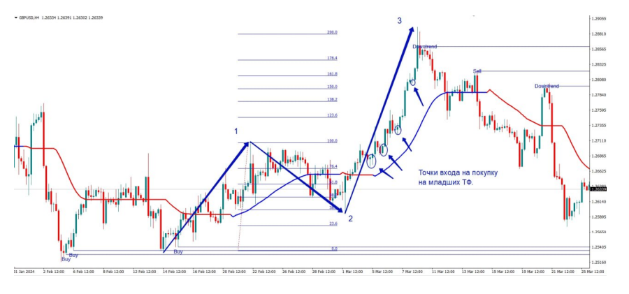 Один из самых успешных методов трейдинга — это торговля по тренду. Эта стратегия подтверждается известной фразой: «Тренд — твой друг». Однако не все трейдеры могут последовательно использовать этот подход. Часто мешают недостаток дисциплины и плохое понимание того, как определить тренд и действовать в его направлении. В этой статье мы не будем говорить о дисциплине, сосредоточимся на технических аспектах. Важно научиться точно определять тренд и понимать, как он заканчивается. Торговля внутри дня Для внутридневной торговли лучше всего следовать тренду на таймфрейме H4. Главная идея проста: Чтобы оценить потенциал, используйте уровни Фибоначчи. Если цена прошла уровни 161.8% – 200% или выше от начальной волны тренда, входите с осторожностью или вообще избегайте. Если тренд имеет потенциал и до сильных уровней поддержки или сопротивления еще далеко, входите в сделки на завершении коррекционных фаз. Открывайте позицию в направлении основного тренда на H4, используя младшие таймфреймы. Это