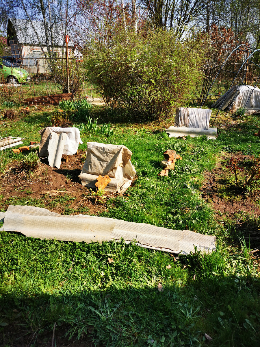 У мамы своя система укрывания, получаются вот такие домики. Большую часть мы убрали, но один слой сверху оставили, так как обещают похолодание.