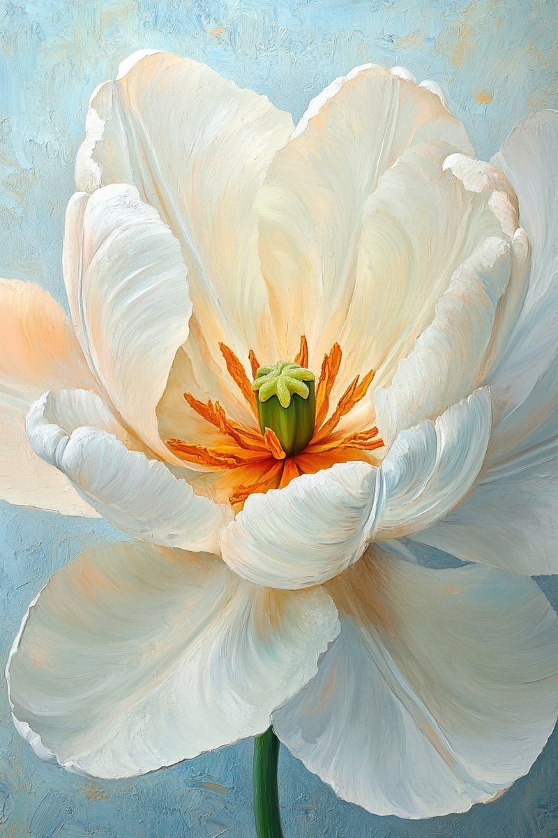 Создано на основе запроса: white tulip with pettles wide open as if wanting to present something inside on a white fine art gently textured