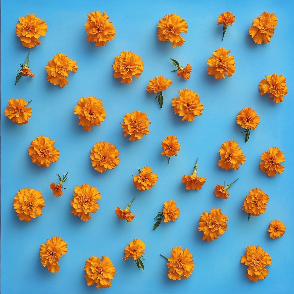 Создано на основе запроса: Many marigolds scattered across a blue background