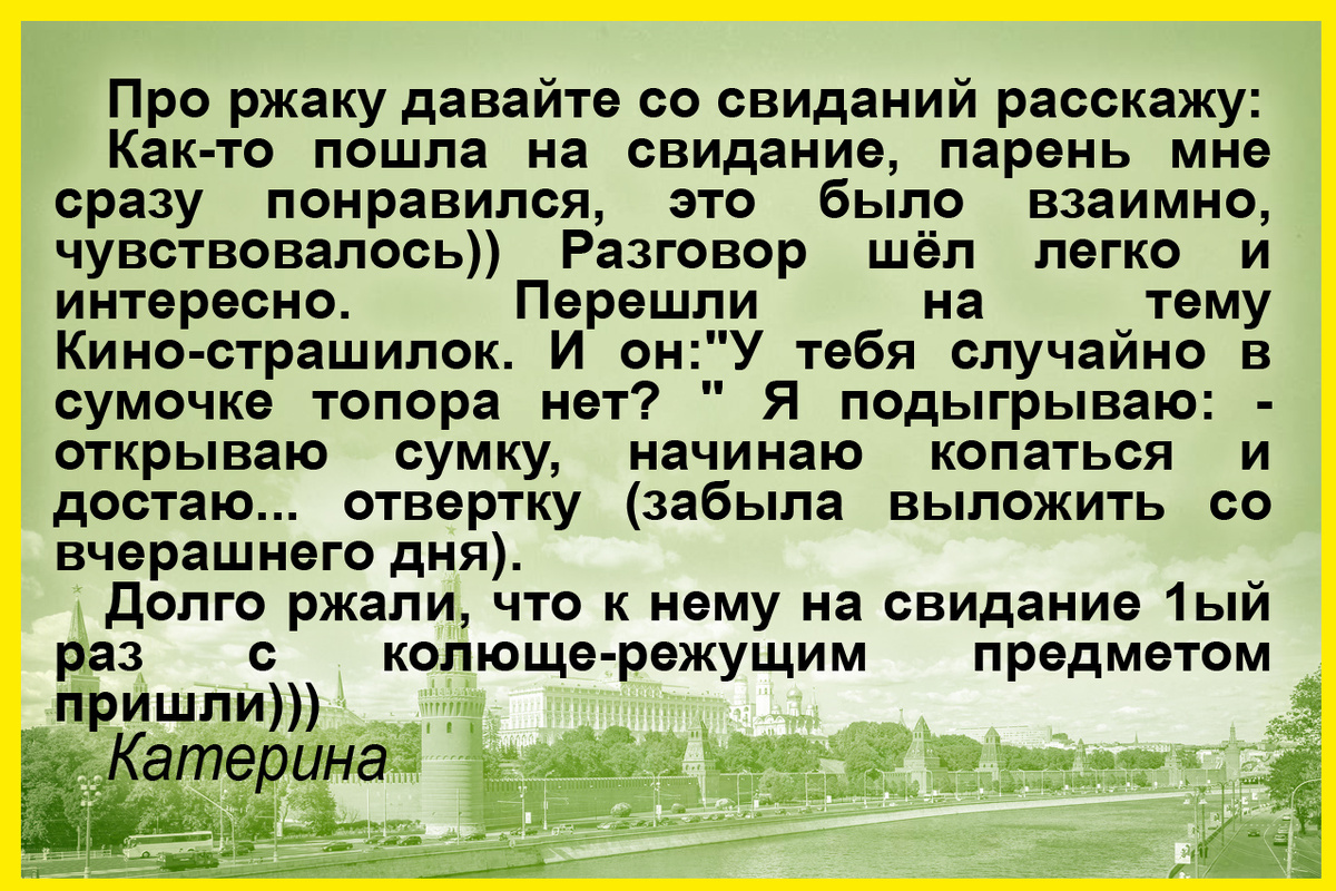 Третья мне рассказывала истории про соседей больных и что отношений у нее уже очень давно не было и прямо напирала пойти к ней домой, "с мамой познакомится". Сразу, после первого свидания!))
