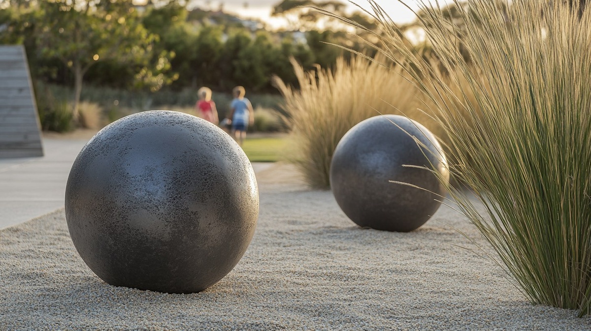 Создано на основе запроса: 60cm tall concrete spheres sitting on sandy gravel in public landscape scene, tall native grasses, close up