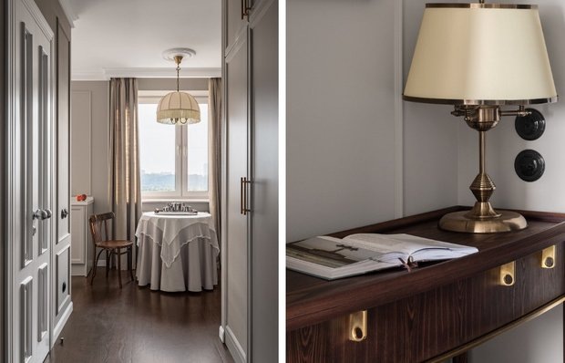 Получилось уютно, благородно и со вкусом Квартира площадью 48 квадратных метров находится в одном из центральных районов Москвы. Хозяин — человек, влюбленный в атмосферу города и его прошлое. Вместе с дизайнером Ксенией Елисеевой они создали интерьер, в котором будто бы отразилась история московской семьи: здесь есть предметы, отсылающие к дореволюционному времени, детали с настроением советского модерна и современные акценты, ненавязчиво встроенные в концепцию. Сохранили изначальную перепланировку и старинный паркет. Дизайнер сделала ставку на глубокие оттенки, классические линии, качественные материалы и световые сценарии, которые зонируют пространство. Квартира получилась цельной — все подчинено идее преемственности эпох и уважения к памяти места. С порога интерьер задает нужное настроение: приглушенный серо-бежевый оттенок стен, симметрично расставленные молдинги, аккуратные плинтусы и карнизы создают ощущение спокойствия и респектабельности. Прихожая довольно компактная, но оформл