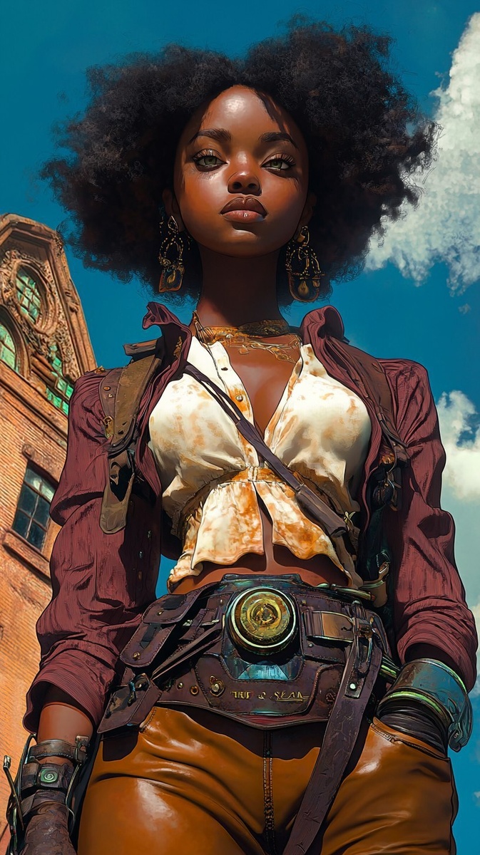 Создано на основе запроса: full body , steam punk , african american female , brown carmel skin, green eyes, standing in front of a brownstone building, blue sky, artist style Thomas Blackshear ,violet details, artstation, hyperdetailed, cory loftis, craig mullins, rutkowski, Mucha , james jean, mucha, subsurface scattering, , hyper realistic, sunlight cinematic lighting rococo art , 8k resolution, clear shape, defined shape in the style of Lee Sylvester Lemon