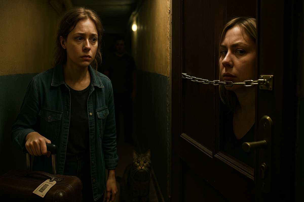 Ночной подъезд пах железом и куревом. Одна из лампочек мигала на потолке, заливая площадку жёлтым, тревожным светом. Чемодан стоял у ног, скрипучий, затёртый, с биркой аэропорта. В ушах гудел перелёт и бессонные сутки. Она чувствовала себя привидением, случайно вернувшимся не в тот дом.