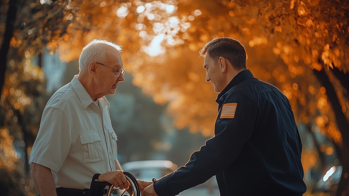 Создано на основе запроса: old decent man with walker getting help from professional patrolman for getting up from a bench in a park