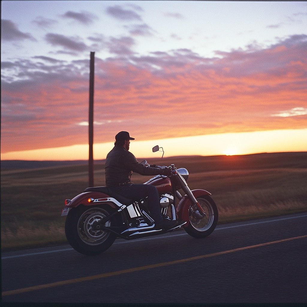 Создано на основе запроса: a photo realistic image taken with a Zeiss 35mm film camera with 50mm sonar lens. Make realistic as possible with extremem detail. Make a landscape image with a man riding a harley davidson motorcycle at a turn off on the side of the road with a magnificint sunset view behind him. Make it current and modern and have him wearing a simple black baseball hat. Motorcycle driver is a male, mid 30's mixed race, 5'11 and 165 lbs.