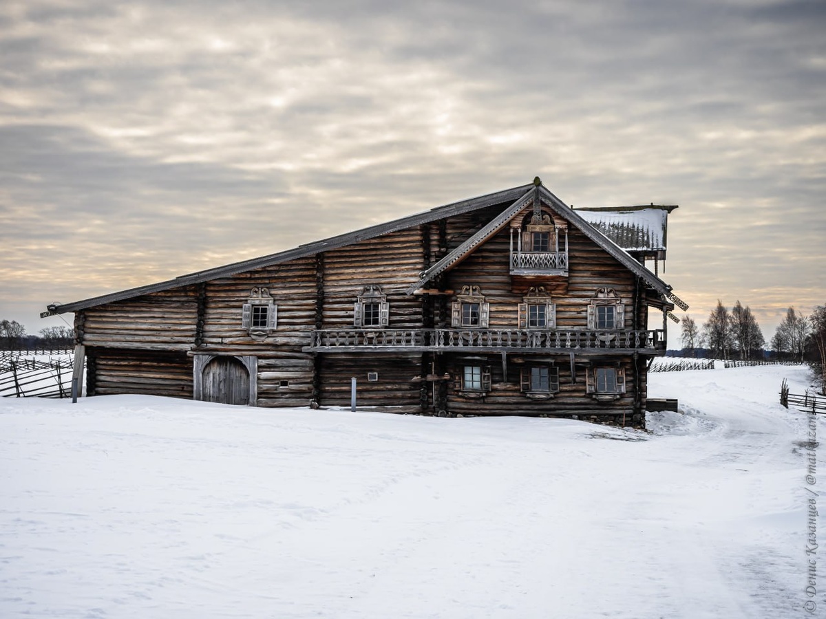 Дом Ошевнева на острове Кижи Дом крестьянина Ошевнева, перевезённый с одноимённой деревни Медвежьегорского района республики, — яркий пример традиционного крестьянского жилья. Постройка выполнена по типу «кошель», широко распространённому в Южной Карелии. Особенность этого решения в том, что изба и двор объединены под одной двускатной крышей, причём вершина проходит точно над осью жилой части, а не по середине всего здания. В результате один скат получается крутым и коротким, а другой — пологим и длинным, словно очертания старинного мешка. Все работы по возведению — от рубки срубов до декоративной резьбы — выполнялись топором. Весь первый этаж крытого двора занимает скотный двор с двумя воротами, хлевы, конюшня, кладовая для фуража и лестница наверх. А наверху — просторный сарай, который служит сеновалом и местом хранения всевозможного земледельческого и промыслового инвентаря. Тут же в непогоду и в холодное время года выполняли многие домашние работы. С «улицы» ведет взвоз — наклон
