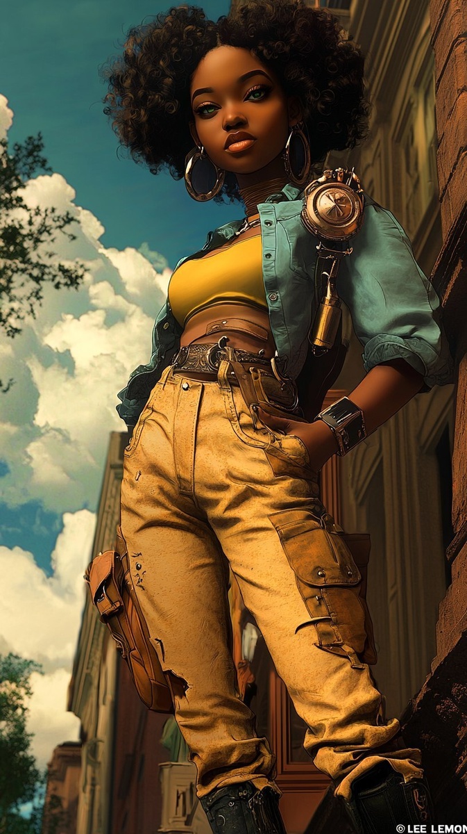 Создано на основе запроса: "LEE LEMON" full body , steam punk , african american female , brown carmel skin, green eyes, standing in front