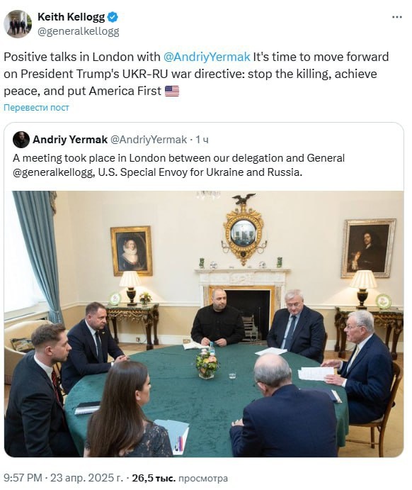 Следует добавить ко вчерашним новостям эту информацию: Спецпредставитель США Келлог встречался в Лондоне с главой администрации укро-президента отдельно от европейских советников по безопасности. «Позитивные переговоры в Лондоне с Андреем Ермаком. Пришло время двигаться вперед в соответствии с директивой президента Трампа о войне между Украиной и Россией: прекратить убийства, достичь мира и поставить Америку на первое место», - написал Келлог. В то время как Ермак писал следующее: «Мы донесли свою позицию и отметили, что немедленное, полное и безусловное прекращение огня должно стать первым шагом к началу переговоров о достижении справедливого и продолжительного мира. Выражали надежду, что это соответствует видению президента США Дональда Трампа Я отметил, что в любых обстоятельствах Украина будет защищать свои принципиальные позиции во время переговоров, поскольку они составляют основы ее суверенитета и территориальной целостности». Премьер-министр Украины Шмигаль встретился с ми