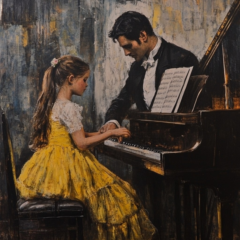 Создано на основе запроса: Chopin teaches a yellow dressed girl play Nocture op9 no 2