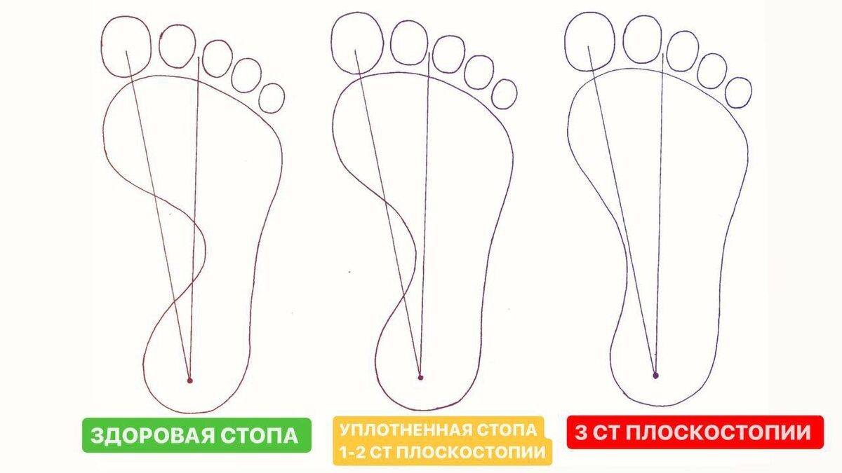 Как проверить, есть ли у вас плоскостопие — простой тест с листами бумаги Всё, что нужно — немного краски, крема или масла и два листа формата А4. ➡️ Нанесите гуашь, можно жирный крем или масло на стопы. Положите два листа бумаги на пол рядом. Встаньте на них босиком, привычно — стопы на ширине таза, тело вертикально. Теперь сделаем 2 простых шага: Шаг 1️⃣ • Поставьте точку в центре пятки. • Затем — в центре большого пальца и между 2 и 3 пальцем. • Соедините каждую из этих точек с пяткой прямыми линиями. • Сравните с картинкой 1 — по расположению линий можно уже многое понять о положении стопы. Шаг 2️⃣ • Нарисуйте три вертикальных отрезка, как на картинке 2 — они делят стопу на зоны. • Посмотрите, как отпечаталась самая узкая часть стопы (в районе свода). • Если отпечаток доходит до второго отрезка или перекрывает все три — есть признаки плоскостопия. Этот тест можно сделать и для своих детей — особенно если замечаете у них быструю утомляемость, «завал» стопы или неустойчивую пох