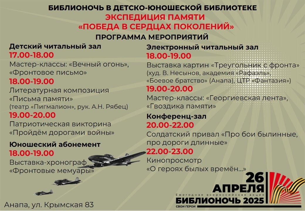 26 апреля (суббота) в 18.00 Академия Рафаэль, Боевое Братство и Центр Творческого Развития "Фантазия" станицы Гостагаевская откроют выставку - проект "Треугольник с фронта" , посвящённую 80-летию Победы в Великой Отечественной Войне ( 1941 - 1945 ). Проект состоит из 12 произведений учеников Центра Творческого Развития "Фантазия" станицы Гостагаевская. Художественный руководитель, Анна Васильевна Ситникова, расскажет об истории создания работ и о новом педагогическом опыте участия в совместном проекте с Академией Рафаэль. Академия Рафаэль покажет на Библионочь часть выставочного проекта из 12 произведений. Художественный руководитель Академии Рафаэль, член Боевого Братства Анапы, автор и куратор проекта "Треугольник с фронта" Владислав Иванович Несынов в этот вечер предоставит возможность потрогать , посмотреть семейные , архивные треугольники с фронта своего родного дяди, Большешапова Виктора Афанасьевича. Живописные произведения, посвящённые победе нашего народа в Великой Отечествен