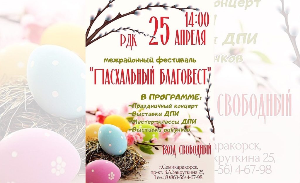 Всех желающих насладиться праздничным концертом, побывать на выставке рисунков, принять участие в мастер-классах по созданию пасхальных поделок приглашает районный Дом культуры в пятницу, 25 апреля, в 14 часов. Вход свободный.