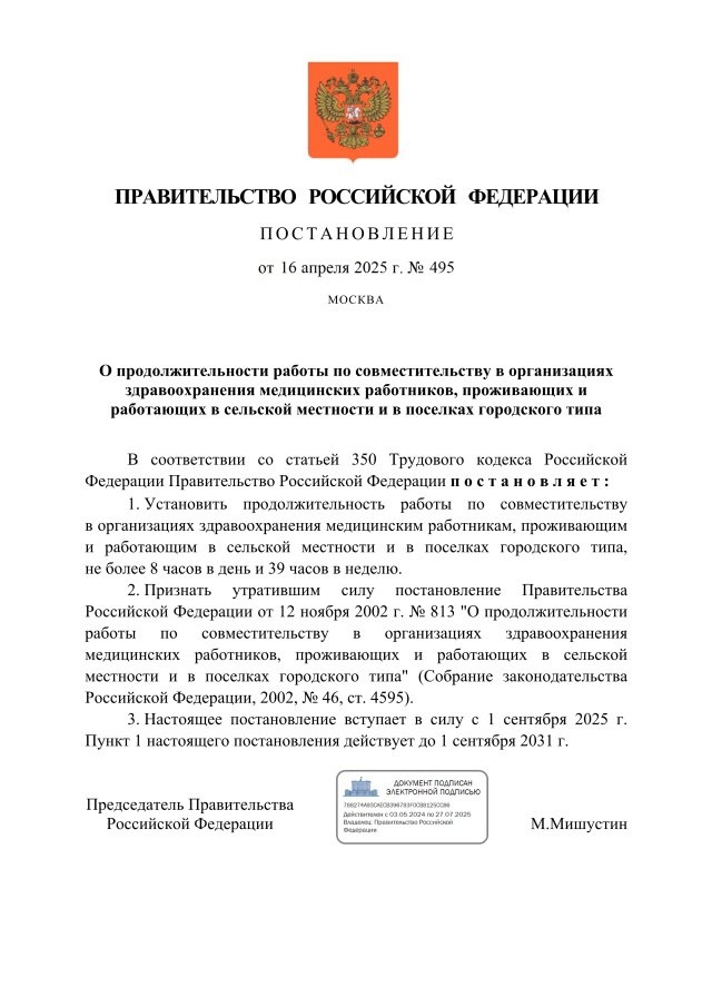Совместительство: медикам переутвердили норму Действующие нормы утверждены постановлением Правительства РФ от 12.11.2002 № 813. В рамках реализации и механизма «регуляторной» гильотины вместо него с 1 сентября будет применяться постановление Правительства России от 16.04. 2025 № 495. Нормы при этом остались прежними. По совместительству в организациях здравоохранения медицинские работники, проживающие и работающие в сельской местности и в поселках городского типа, могут работать не более 8 часов в день и 39 часов в неделю. Блог—Инженера для тебя ❤️ ⭐️ СУОТ 📍 Услуги