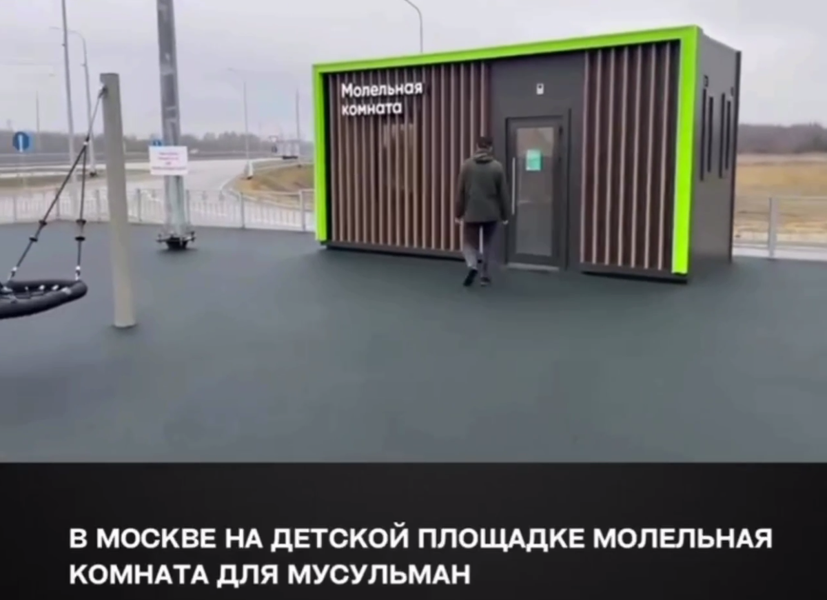В парке 50-летия Октября, что на западе Москвы, теперь есть место, которое выделяется на фоне привычных качелей и турников. Рядом с детской площадкой появилась молельная кабинка — небольшая постройка, похожая на аккуратный садовый домик. На двери табличка: «Молельная комната». Внутри всё продумано до мелочей: полки для обуви, крючки для одежды, ковры на полу и даже краны с горячей и холодной водой для ритуального омовения. Стены украшены стрелками, указывающими направление для молитвы, а на полу лежат мягкие коврики, «на всякий случай», как шутят местные.