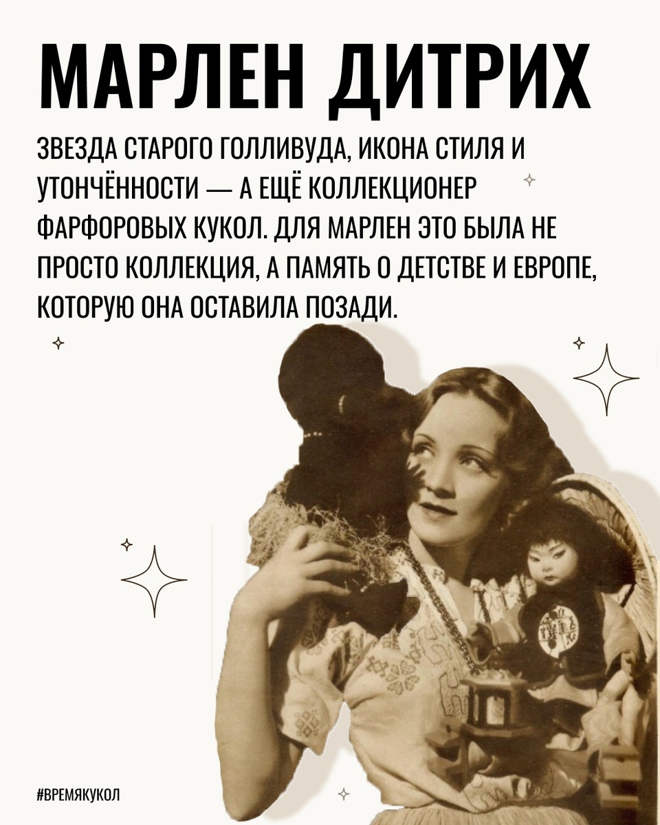 Коллекционирование кукол — не просто увлечение. Это история, эстетика и страсть, которая объединяет людей по всему миру. Даже тех, чьё имя известно каждому. Сегодня мы говорим о знаменитостях, для которых куклы стали чем-то большим, чем просто игрушкой. А уже 21–25 мая мы с вами встретимся на выставке Время кукол — чтобы снова вдохновиться, поразиться, влюбиться и, возможно, начать свою собственную историю коллекционирования. 21-25 мая 12:00 - 19:00 Время Кукол