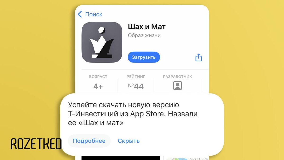 Шах и мат, модераторы App Store «Т-Банк» выпустил в App Store новое приложение «Т-Инвестиций» — оно называется «Шах и мат». Скачать можно здесь. Как обычно, приложение, скорее всего, удалят в течение нескольких часов. 💼 Rozetked | Подписаться