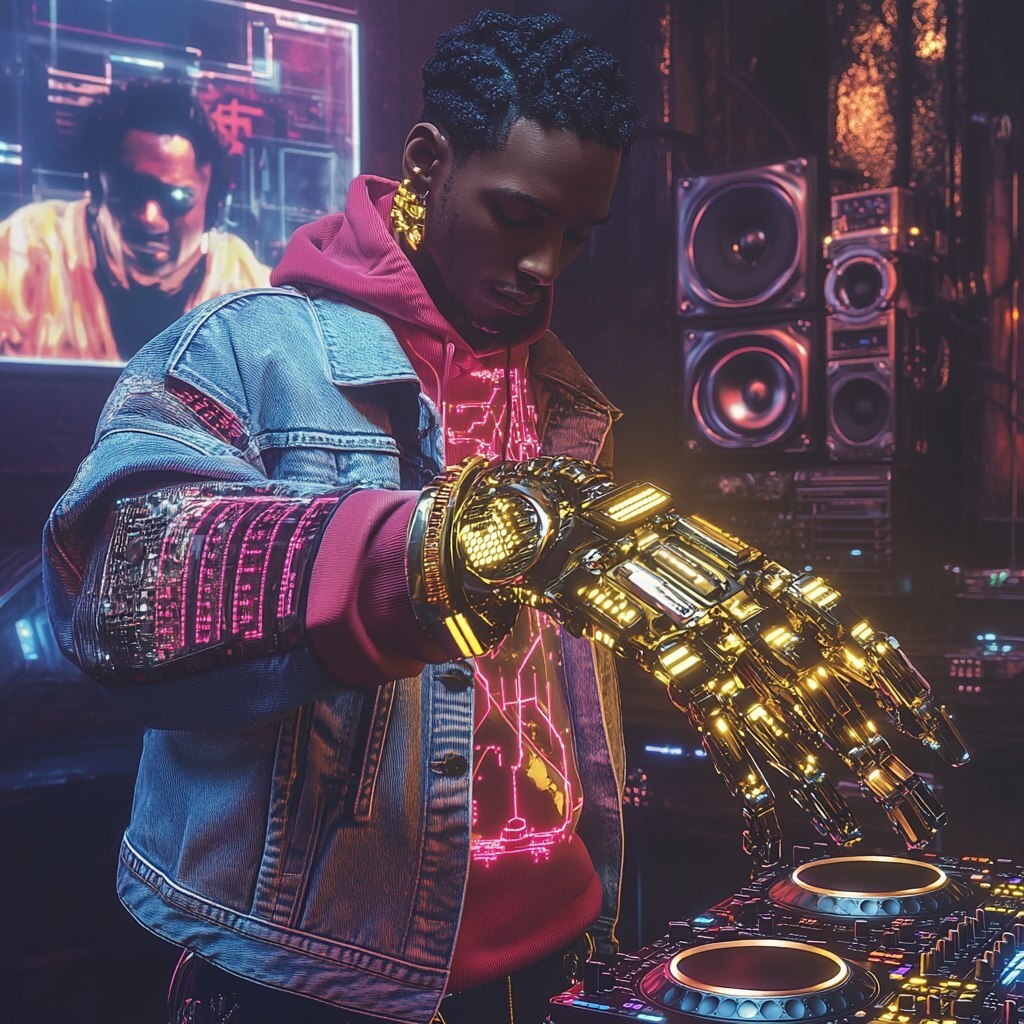 Создано на основе запроса: "Black male model with a golden robotic arm performing in a futuristic hip-hop club. He wears a red LED sweatshirt with sound-reactive graphics, oversized denim jacket covered in chrome patches and vinyl pieces. His arm is plugged into a DJ console glowing with circuit lights. Background shows animated graffiti, speakers stacked to the ceiling, neon turntables, and holograms of old-school rappers. Moody lighting, cyberpunk hip-hop editorial, cinematic photography --- Автоперевод: "Черная мужская модель с золотой роботизированной рукой, выступающей в футуристическом хип-хоп-клубе. Он носит красную светодиодную толстовку с звукореактивной графикой, негабаритной джинсовой курткой, покрытой хромированными пятнами и виниловыми. Интересно вышло? 🤔 https://dzen.ru/id/65c0c65c86e4f837c27b24d7 #ИИ #AI #нейросеть #midjourney #art