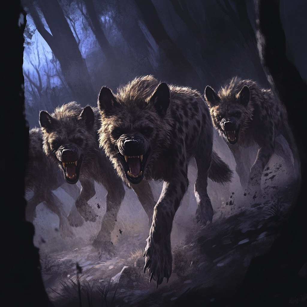 Создано на основе запроса: make Hyenas as dark and bad villians making conspirancy for destroy their enemy