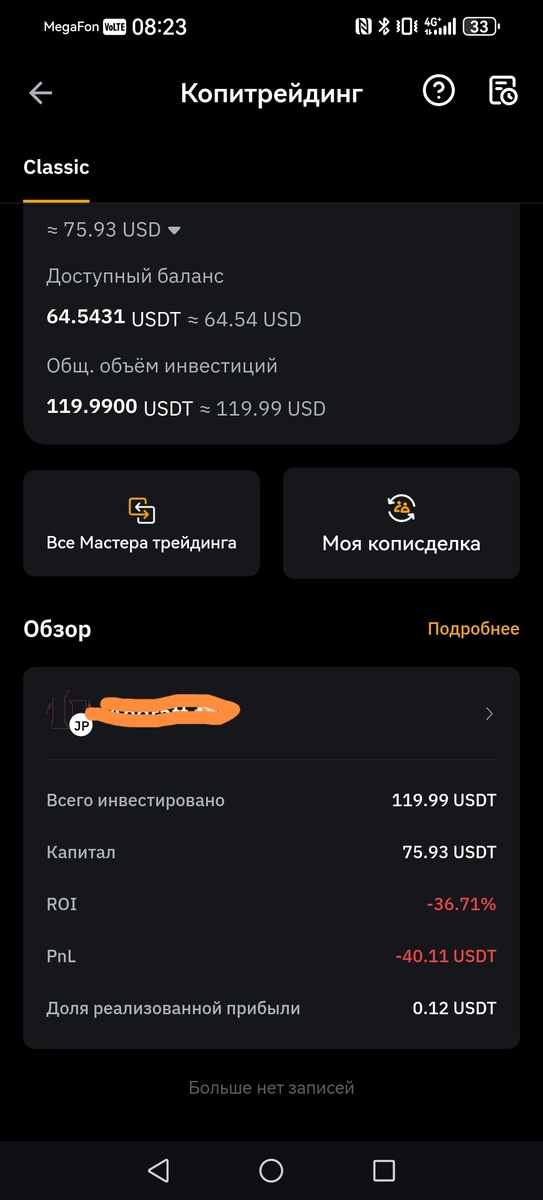 Не смог смотреть как трейдер сливает мой депозит и закрыл подписку на него с убытком около 37 %. Решив, что и сам сумею профукать депозит ничуть не хуже этого парня, я сам стал Мастером трейдинга, вступив в программу копитрейдинга Bybit. Пока торговля идёт в мою пользу: 26 успешных сделок против 6 убыточных. Сегодня перевёл на счёт Мастера трейдинга оставшиеся от подписки 75 usdt. Это позволит увеличить объем маржи в сделках.