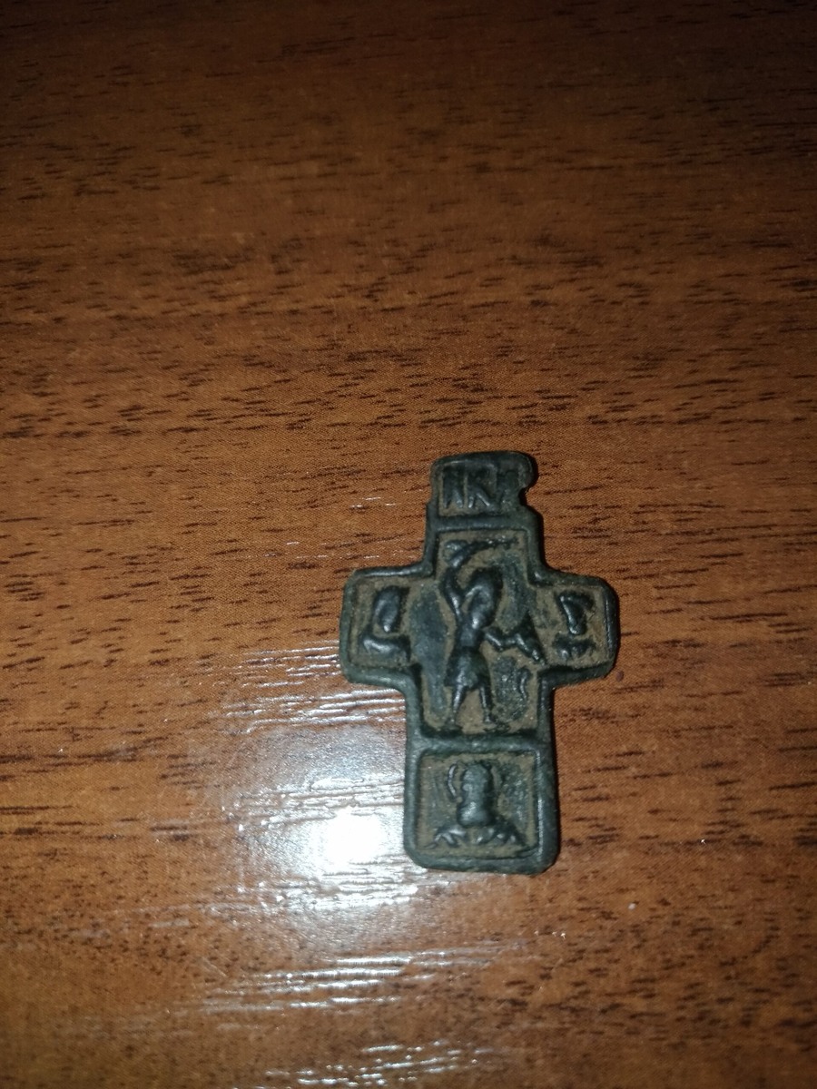 В тот день я отправился на поиски один, больше никто не смог. Поэтому я решил съездить на старое, хорошо известное мне место. Бывал там неоднократно и всегда что-нибудь попадалось. Вот и в этот раз находки были какими-то стандартными-монетки разных эпох, несколько пуговиц, гильзы, и другой менее интересный металлический хлам. Проходив до полудня, я перекусил и решил походить ещё несколько часов, прежде чем отправиться домой. И вот очередной сигнал оказался крестиком. Когда я откопал его и очистил, то увидел довольно интересную гравировку, значение которой не знал. Я сфотографировал его и выложил в один форум, в надежде, что кто-нибудь подскажет значение. После этого продолжил свой путь.
