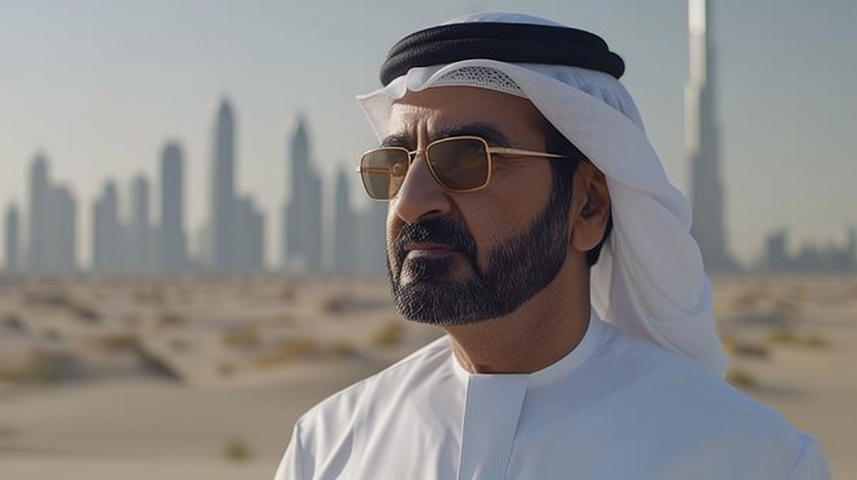 Создано на основе запроса: A wide shot of the Dubai Shaikh Mohammed bin Rashid Al Maktoum Watching arounds in a open desert area