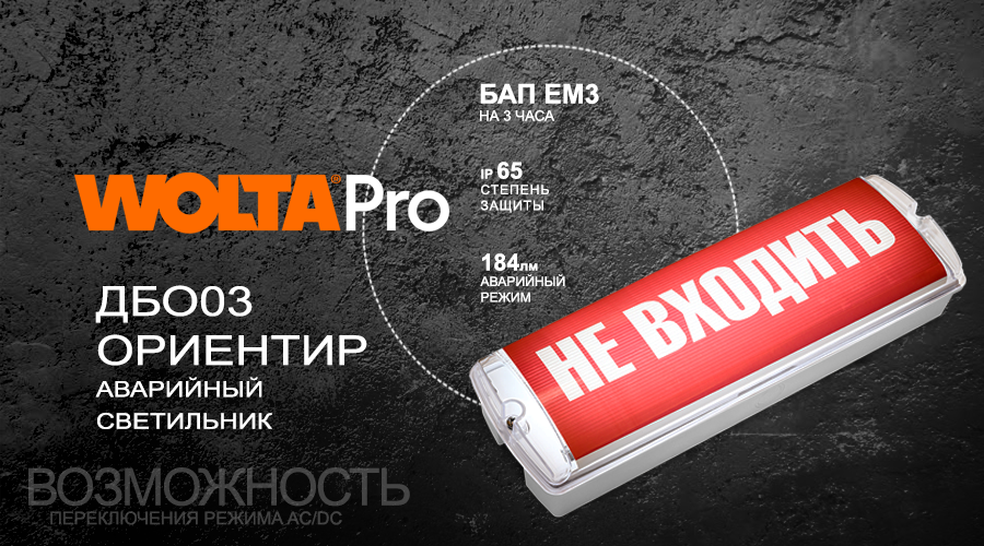 Торговая марка WOLTA®Pro рада представить новинку — аварийные светильники ДБО03 ОРИЕНТИР, произведенные в России. Эти устройства разработаны специально для обеспечения аварийно-эвакуационного освещения и обозначения путей эвакуации в случае отключения электроэнергии. Благодаря своим характеристикам и высокому качеству исполнения они становятся незаменимым решением для объектов с повышенными требованиями к безопасности. Основной задачей аварийных светильников является обеспечение безопасной эвакуации людей в условиях чрезвычайных ситуаций. ДБО03 ОРИЕНТИР оснащен встроенным блоком аварийного питания (БАП), который гарантирует работу устройства в течение 3 часов после отключения основного электроснабжения. Этого времени достаточно, чтобы люди могли покинуть помещение и избежать паники даже в полной темноте. Аккумулятор светильника имеет функцию защиты от глубокого разряда и перезаряда, что значительно увеличивает срок его службы. В аварийном режиме световой поток составляет 184 лм, что об
