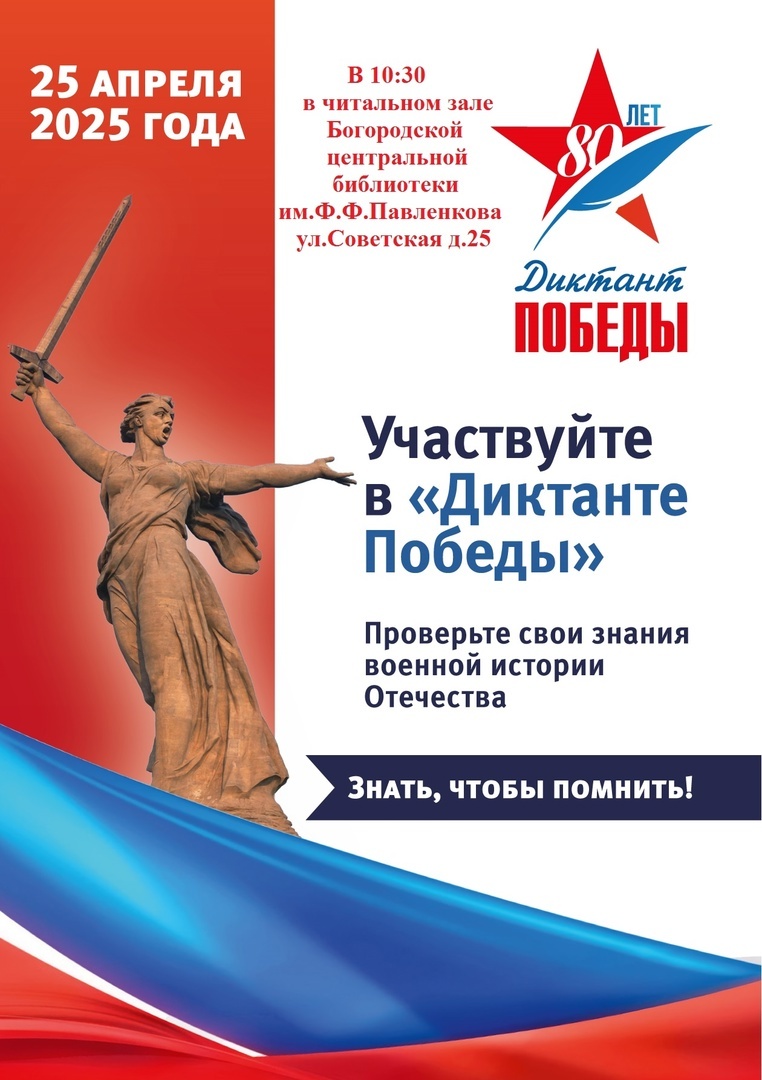 «Диктант Победы» — это Всероссийская историческая акция на тему событий Великой Отечественной войны. Проводится ежегодно, начиная с 2019 года, во всех регионах России и более чем в 60 странах мира. Направлена на повышение исторической грамотности и патриотическое воспитание молодёжи. ✅ В 2025 году акция состоится 25 апреля. Принять в ней участие можно как очно на одной из региональных площадок, так и онлайн на официальном сайте акции (диктантпобеды.рф). Диктант включает в себя два варианта по 25 вопросов в каждом, время ответа — 45 минут. Вопросы носят разноплановый характер: нужно вставить пропущенные слова в тексте, назвать автора поэмы, посвящённой войне, на основании приведённого отрывка назвать город, событие или участника военных действий.